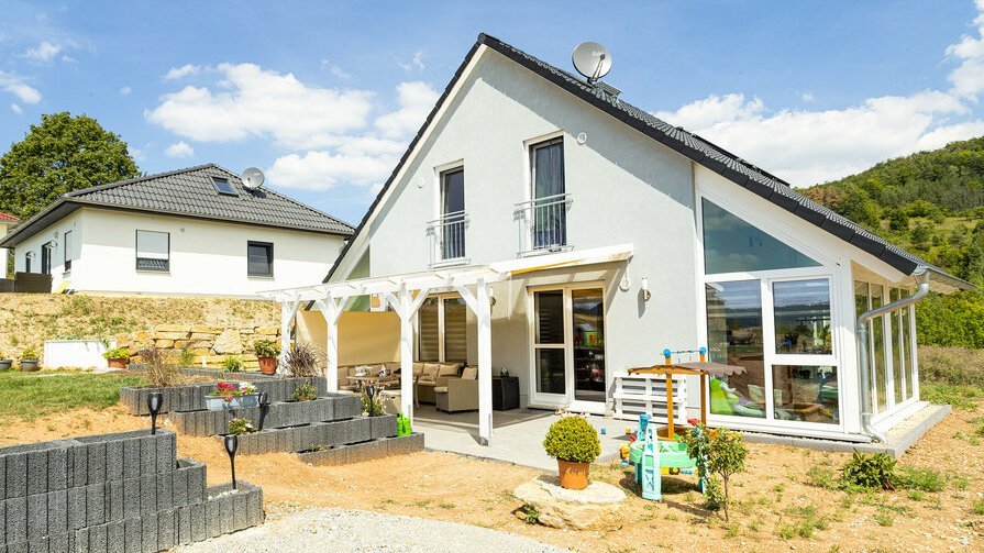 „Wünsche wie ein Walmdach auf der Doppelgarage haben anfangs nicht ins Budget gepasst“, erklärt die Bauherrin Steffi A.. „Nach Fertigstellung des Hauses blieb jedoch noch so viel Geld übrig, so dass wir noch die Garage samt Dach bauen konnten. Im Garten haben wir dann im Frühjahr auch schnell den Rasen angelegt und die Terrasse gebaut, so dass wir vorerst fertig sind.“